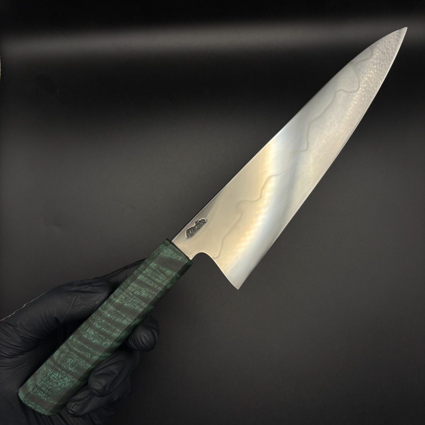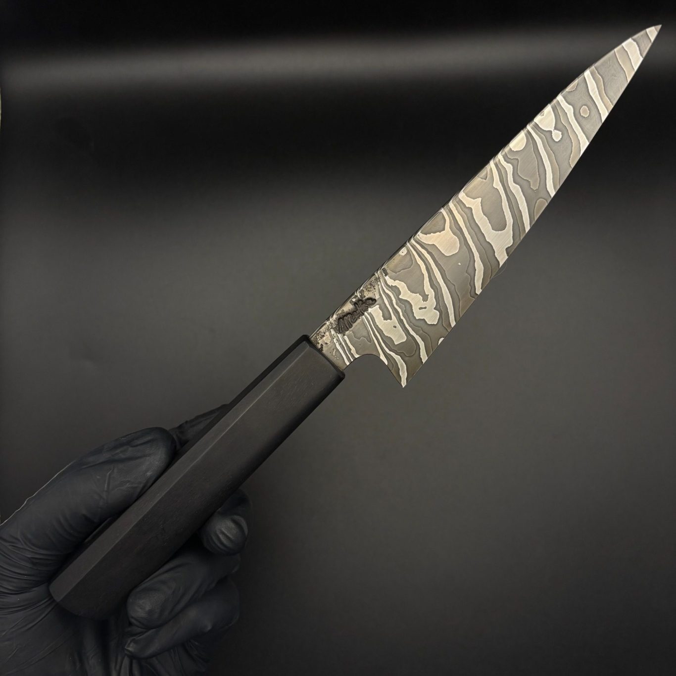 Mit ca. 120g sind die Kochmesser sehr leicht, ich achte dabei auf einen guten Schwerpunkt. Dieser liegt in der Regel am Übergang zwischen Griff und Klinge. Der Klingenrücken und die Kehle sind abgerundet. Was bei längeren Kochsessions Druckstellen an den Fingern verhindert.